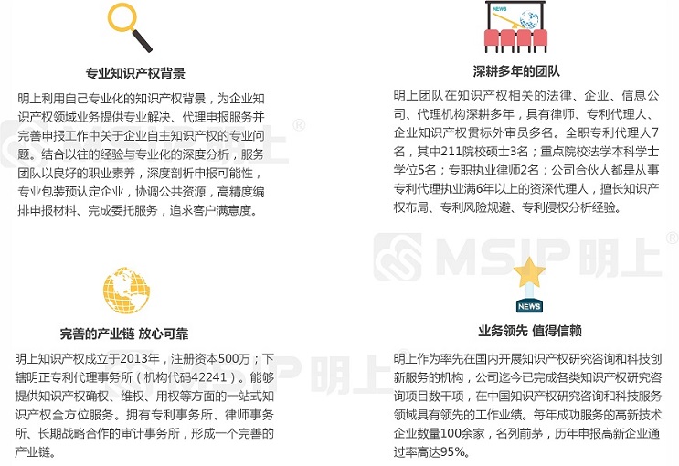1、專業(yè)知識產權背景——明上利用自己專業(yè)化的知識產權背景,為企業(yè)知識產權領域業(yè)務提供專業(yè)解決、代理申報服務并完善雙軟認證中關于企業(yè)自主知識產權的專業(yè)問題。