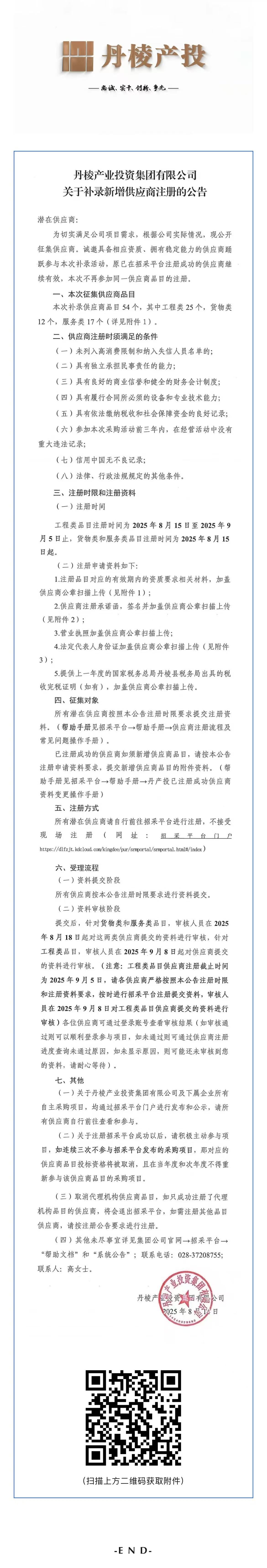 丹棱產(chǎn)業(yè)投資集團有限公司關于補錄新增供應商注冊的公告