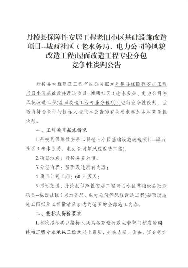 【大雅建筑公司】丹棱縣保障性安居工程老舊小區(qū)基礎(chǔ)設(shè)施改造項(xiàng)目--城西社區(qū)(老水務(wù)局、電力公司等風(fēng)貌改造工程)屋面改造工程專業(yè)分包競爭性談判公告