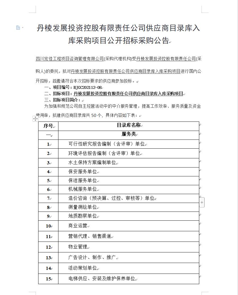 【丹發(fā)展公司】丹棱發(fā)展投資控股有限責(zé)任公司供應(yīng)商目錄庫入庫采購項目公開招標(biāo)采購公告