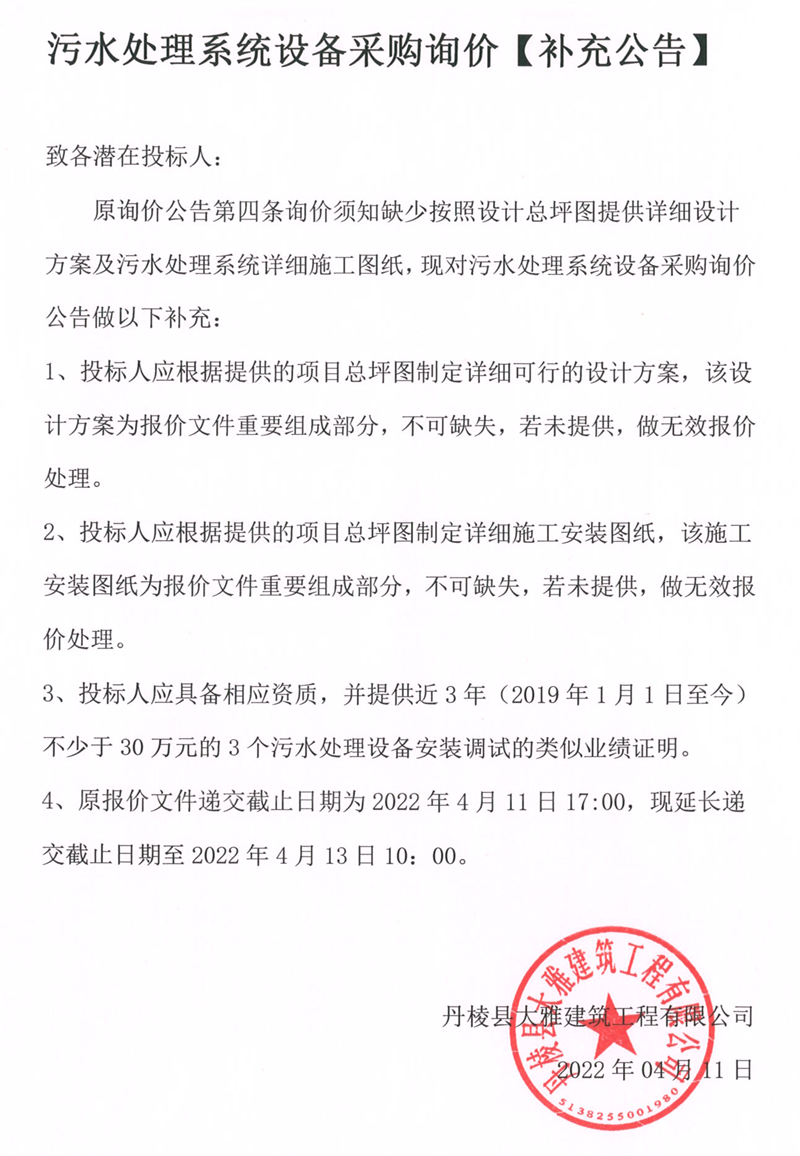 污水處理系統(tǒng)設(shè)備采購詢價補充公告
