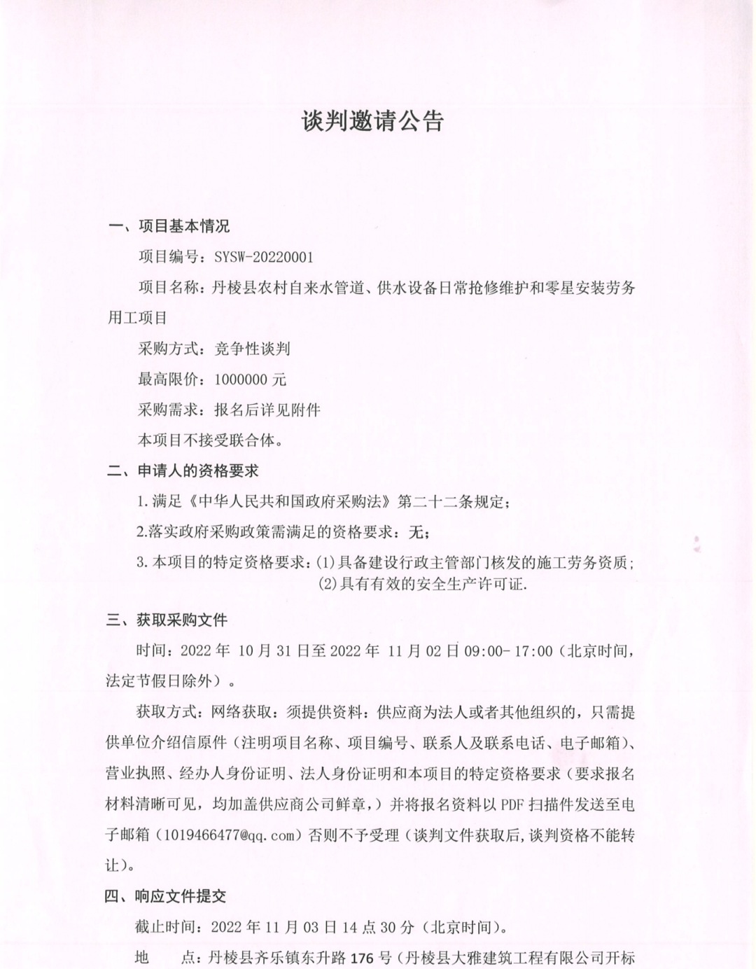 丹棱縣農(nóng)村自來(lái)水管道、供水設(shè)備日常搶修維護(hù)和零星安裝勞務(wù)用工項(xiàng)目談判邀請(qǐng)公告