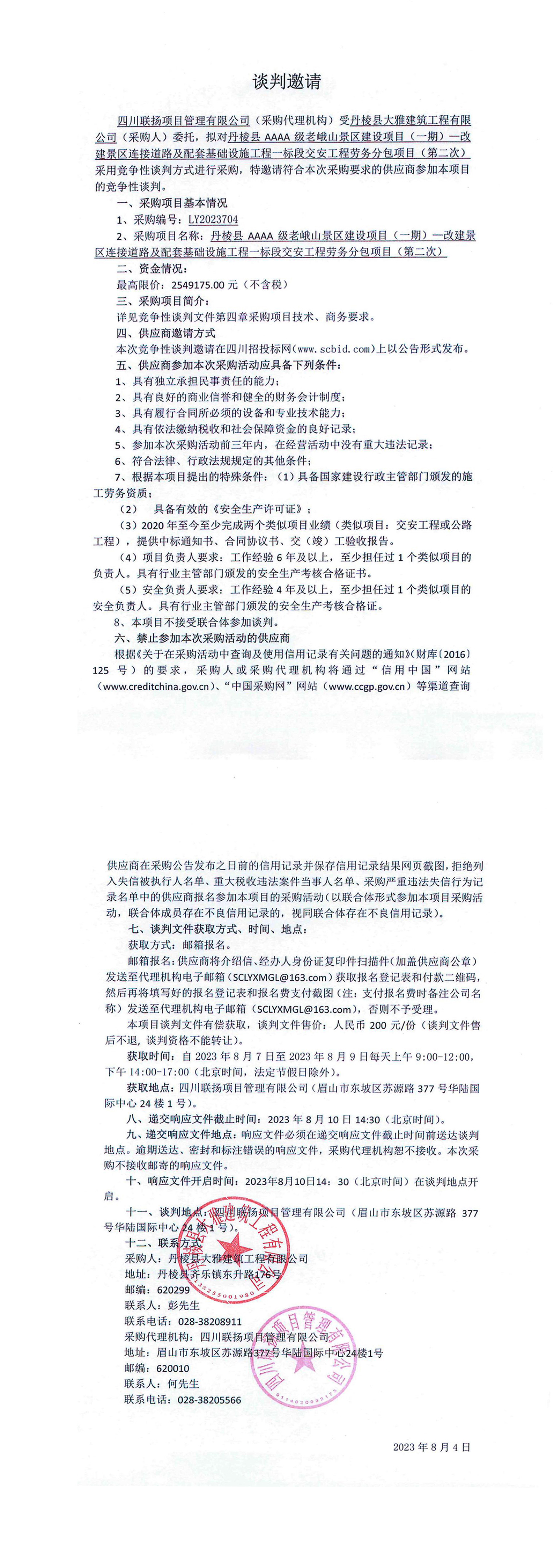 丹棱縣AAAA級老峨山景區(qū)建設(shè)項(xiàng)目(一期)一改建景區(qū)連接道路及配套基礎(chǔ)設(shè)施工程一標(biāo)段交安工程勞務(wù)分包項(xiàng)目(第二次)談判邀請