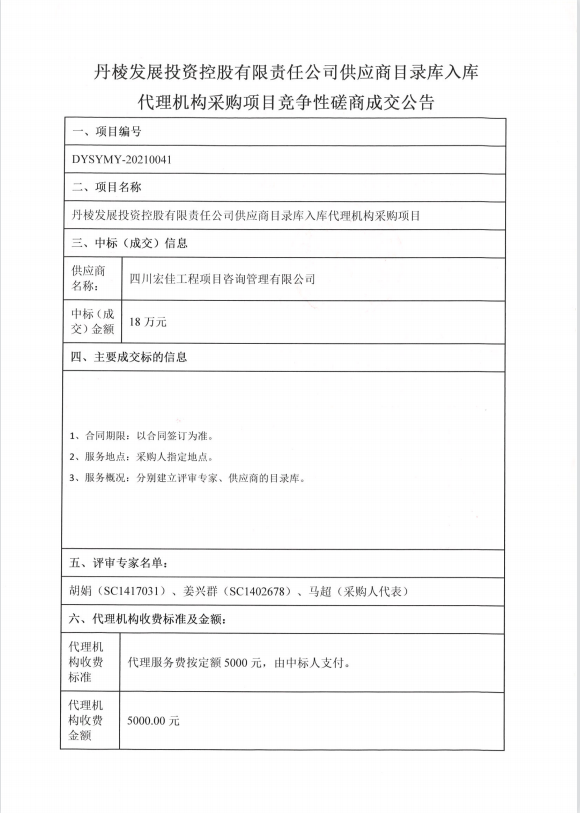 【丹發(fā)展公司】丹棱發(fā)展投資控股有限責(zé)任公司供應(yīng)商目錄庫入庫代理機(jī)構(gòu)采購(gòu)項(xiàng)目競(jìng)爭(zhēng)性磋商成交公告