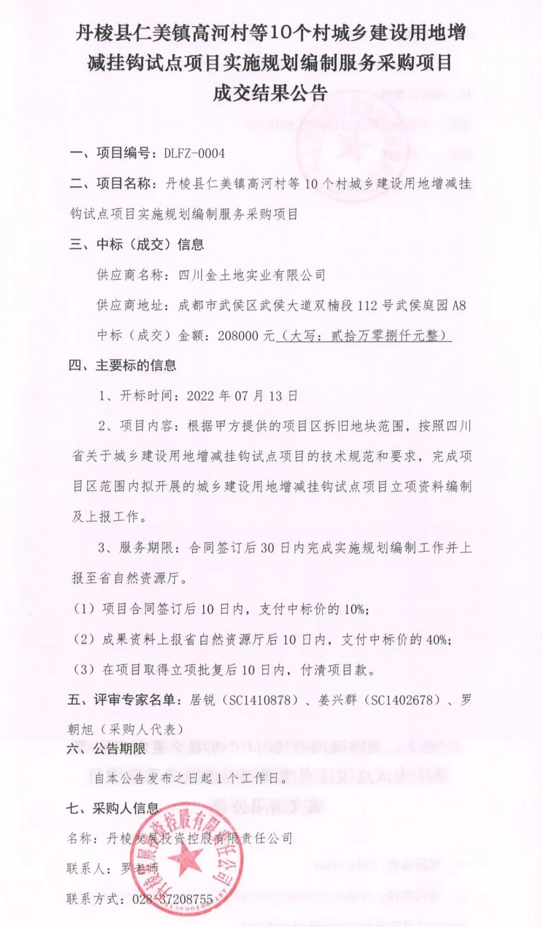 丹棱縣仁美鎮(zhèn)高河村等10個村城鄉(xiāng)建設(shè)用地增減掛鉤試點(diǎn)項目實(shí)施規(guī)劃編制服務(wù)采購項目成交結(jié)果公告