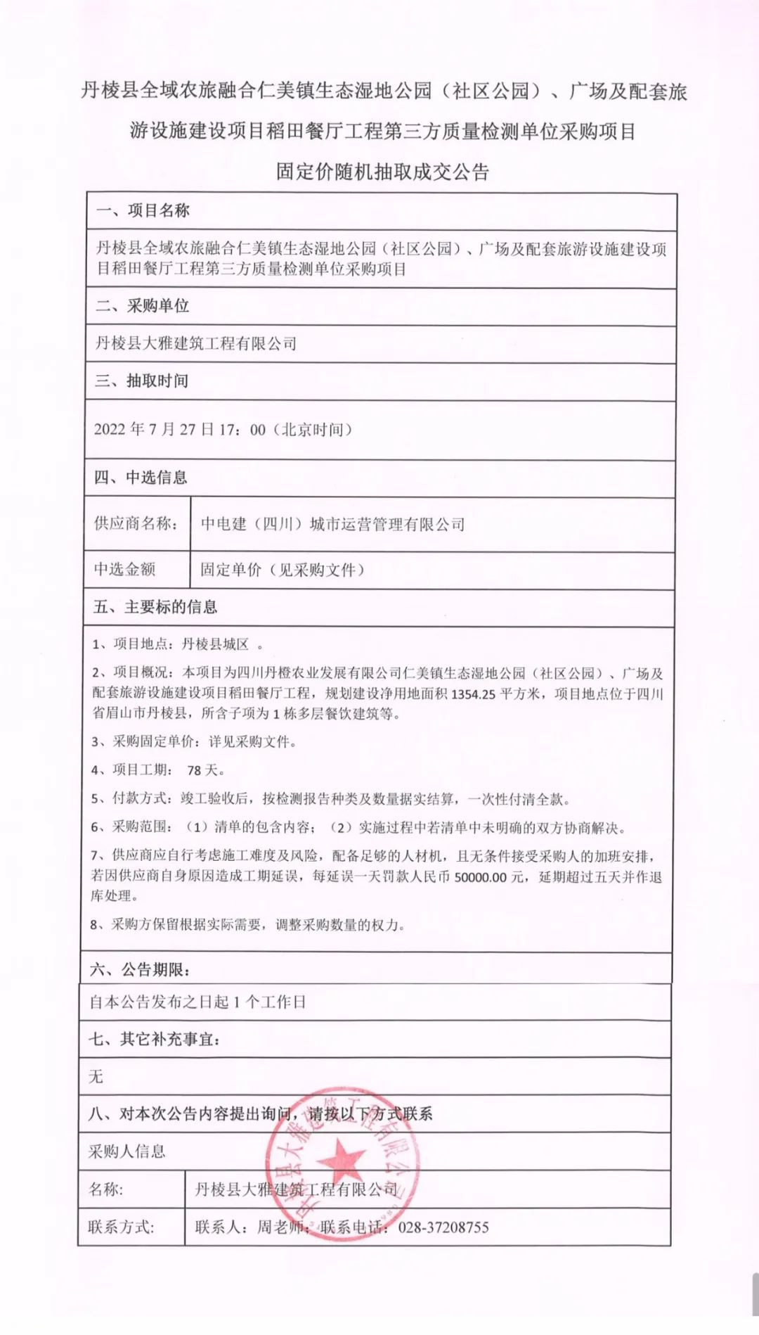 仁美鎮(zhèn)生態(tài)濕地公園(社區(qū)公園)、廣場(chǎng)及配套旅游設(shè)施建設(shè)項(xiàng)目稻田餐廳工程第三方質(zhì)量檢測(cè)單位采購項(xiàng)目固定價(jià)隨機(jī)抽取成交公告