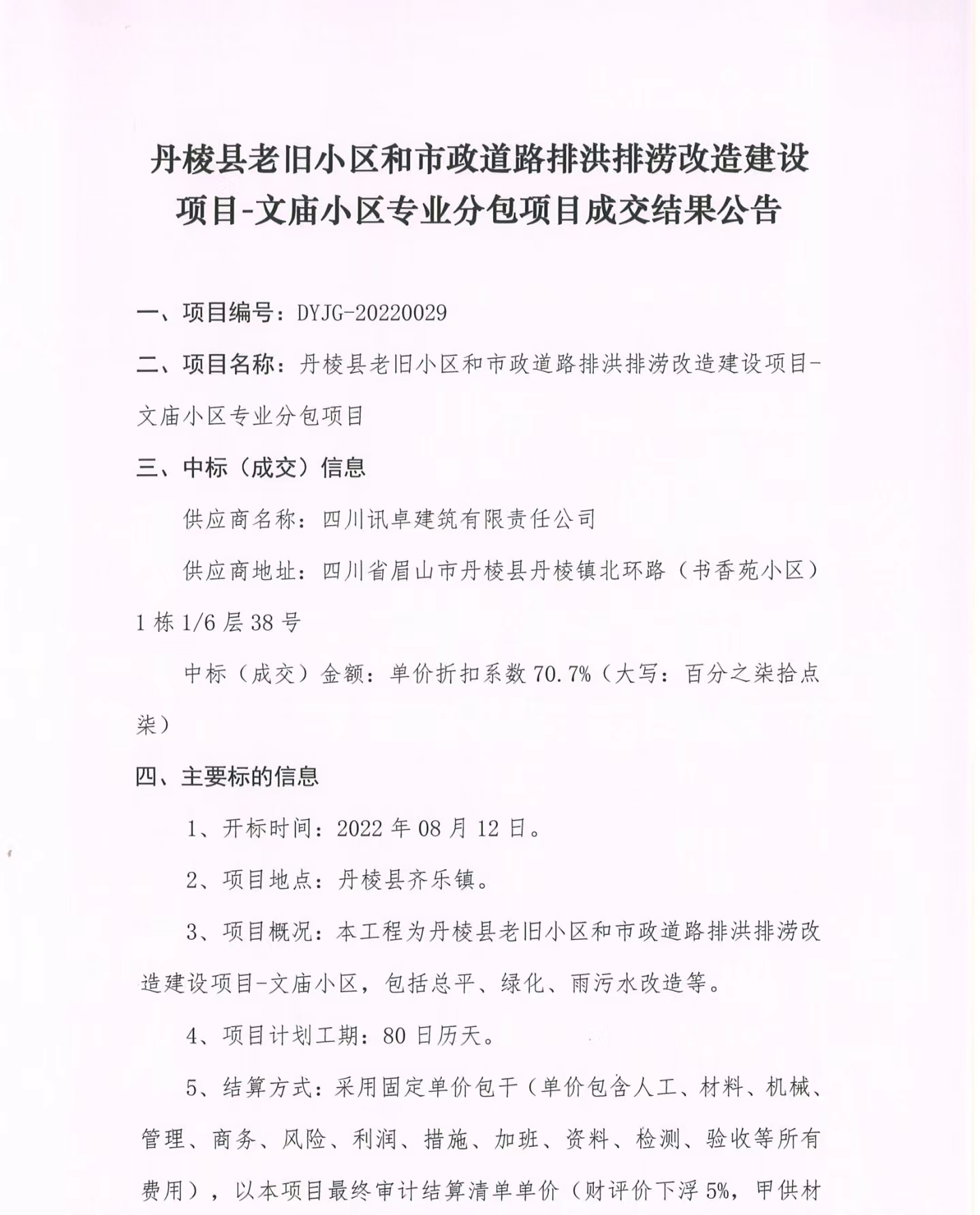 丹棱縣老舊小區(qū)和市政道路排洪排澇改造建設(shè)項(xiàng)目-文廟小區(qū)專業(yè)分包項(xiàng)目成交結(jié)果公告