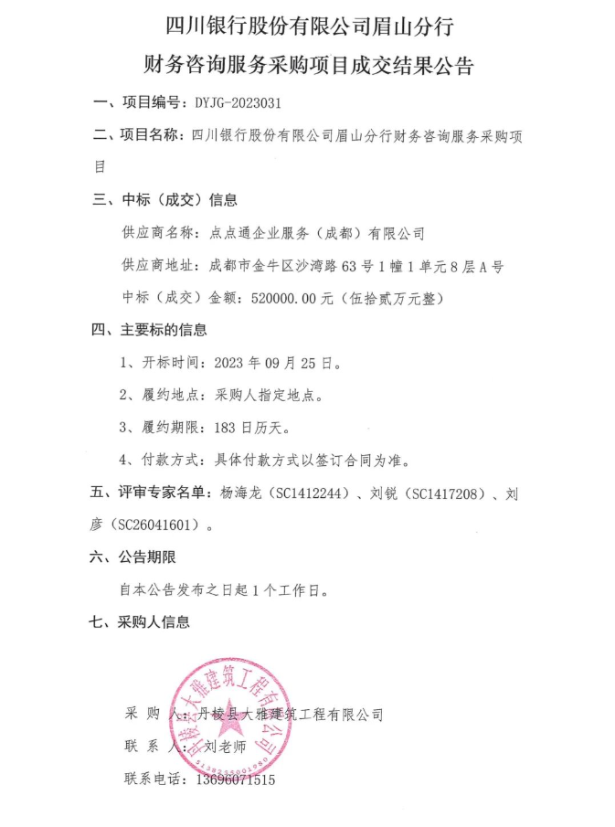 四川銀行股份有限公司眉山分行財(cái)務(wù)咨詢(xún)服務(wù)采購(gòu)項(xiàng)目成交結(jié)果公告