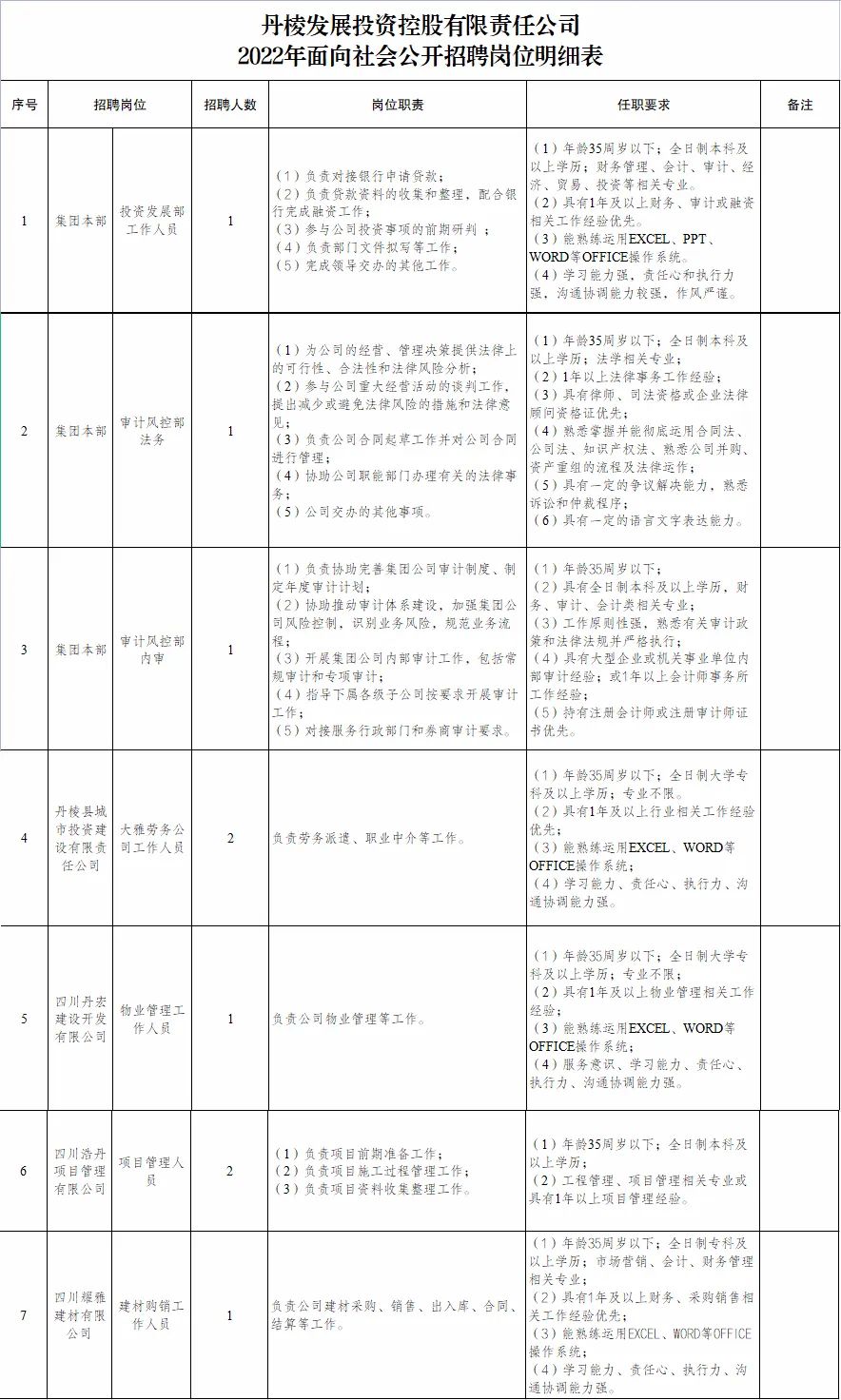 招聘崗位的學(xué)歷、專(zhuān)業(yè)、資歷、年齡等資格條件詳見(jiàn)附件《丹棱發(fā)展投資控股有限責(zé)任公司2022年面向社會(huì)公開(kāi)招聘崗位明細(xì)表》。